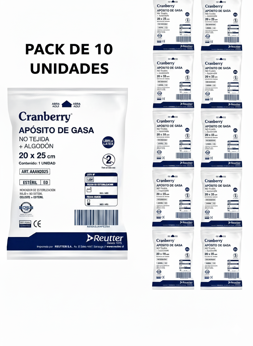 Especificación: APÓSITO GASA ESTÉRIL NO TEJIDO 20X25CM CRANBERRY X10 UNID