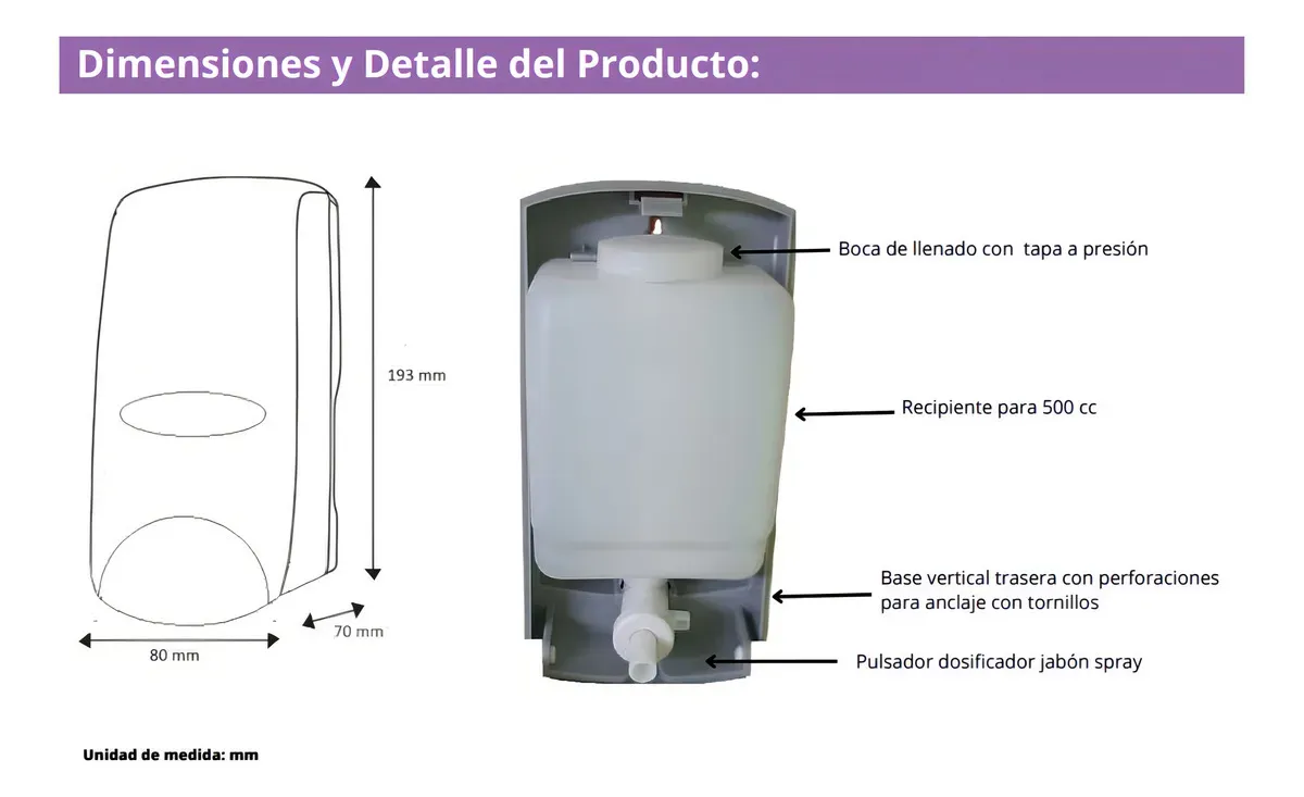 Especificación: DISPENSADOR DE JABÓN PLÁSTICO 500ML TAUMM