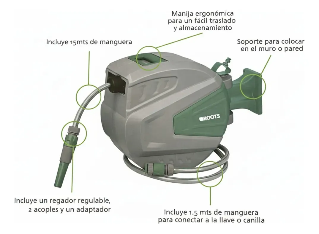 Especificación: ENROLLADOR DE MANGUERA AUTO RETRÁCTIL CARRETE DE 15M ROOTS