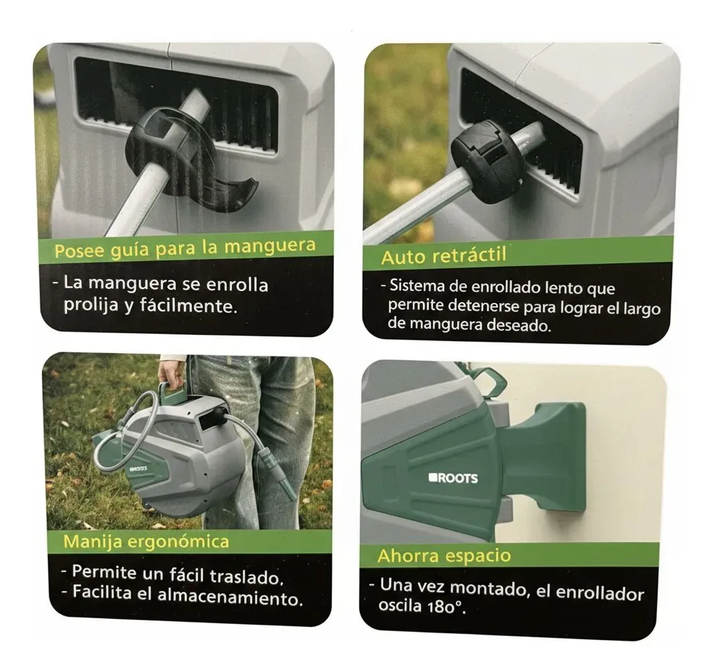 Ideal para jardineros, propietarios de viviendas y entusiastas del cuidado del hogar, el Enrollador De Manguera Auto Retráctil Roots es una inversión que mejora la experiencia de uso y optimiza el tiempo dedicado a las tareas al aire libre. Mantén tu espacio organizado y disfruta de la comodidad que ofrece este práctico carrete.