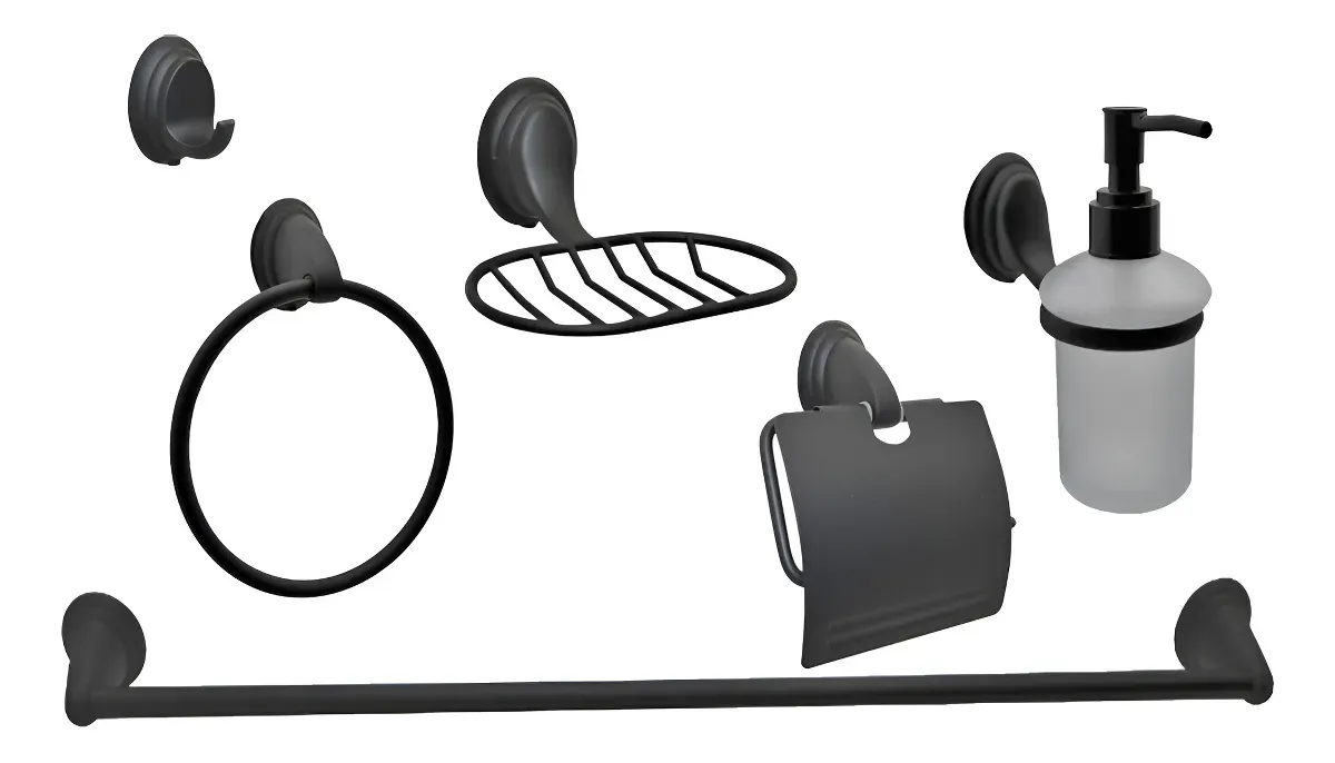 El set incluye una jabonera botella, una jabonera rejilla, un perchero, un porta rollo, un toallero barra y un toallero de mano, cubriendo todas tus necesidades de organización y uso diario. Cada accesorio ha sido cuidadosamente diseñado para ofrecer funcionalidad sin sacrificar la estética, convirtiendo tu baño en un lugar de relajación y confort.